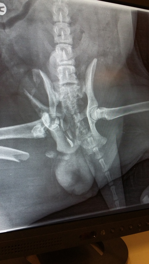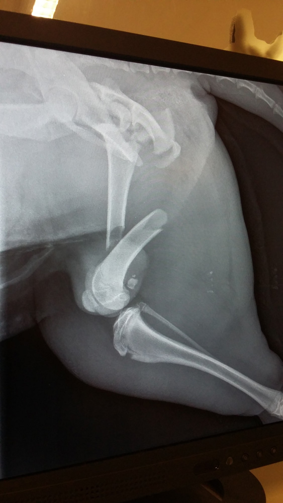Baxter sustained multiple fractures of the pelvis, a midshaft fracture of his right femur and a suspected dislocated right elbow with a nasty degloving wound to this foreleg. Poor Baxter had only one unaffected leg.